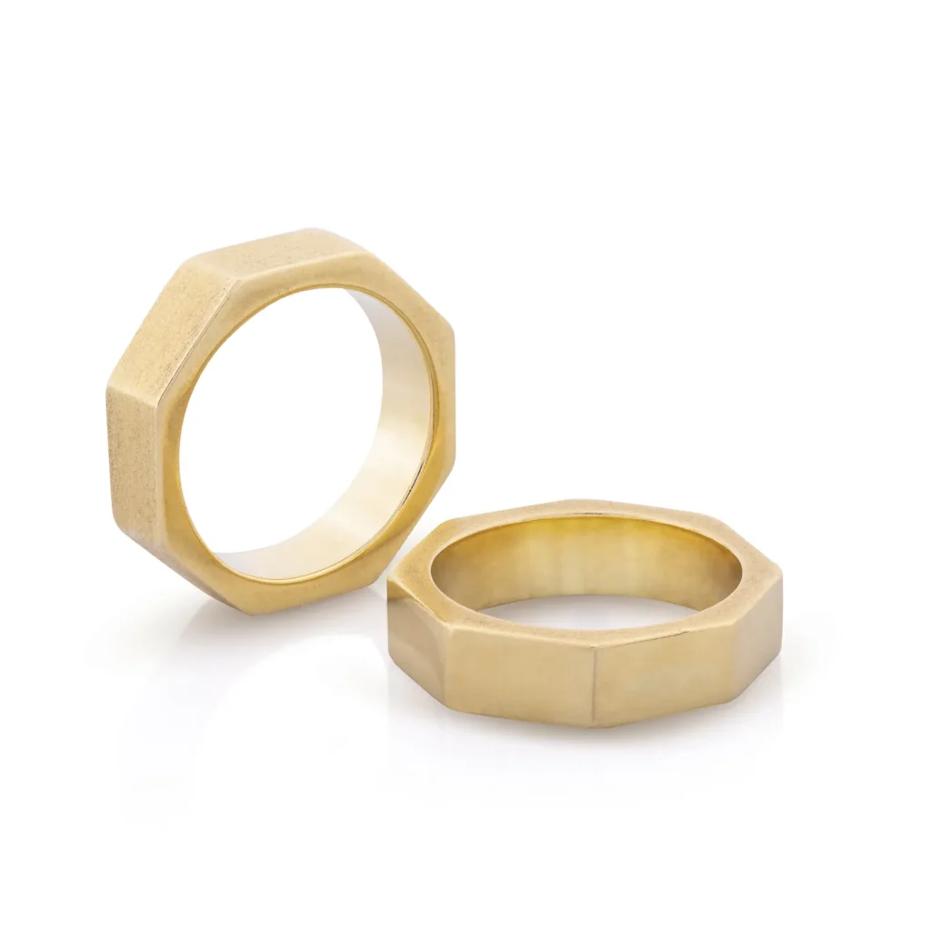 Octagonal rings in 18k yellow gold, offered in sizes 5 to 13, feature a sophisticated width of 0.5 cm.