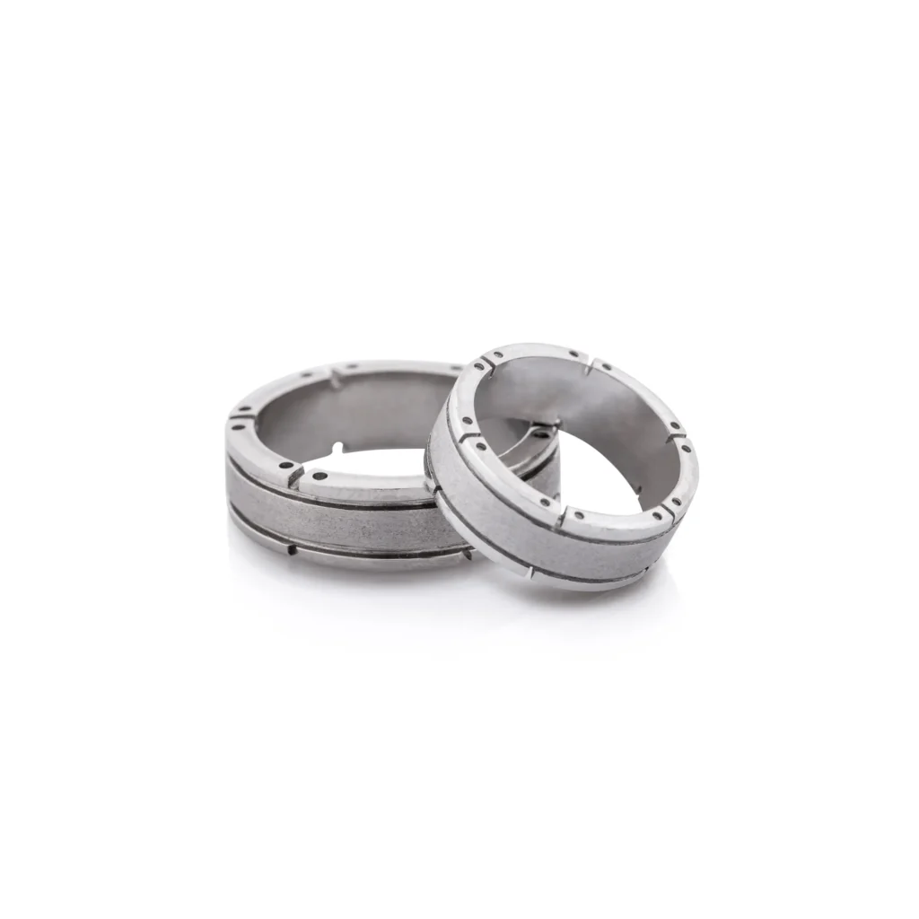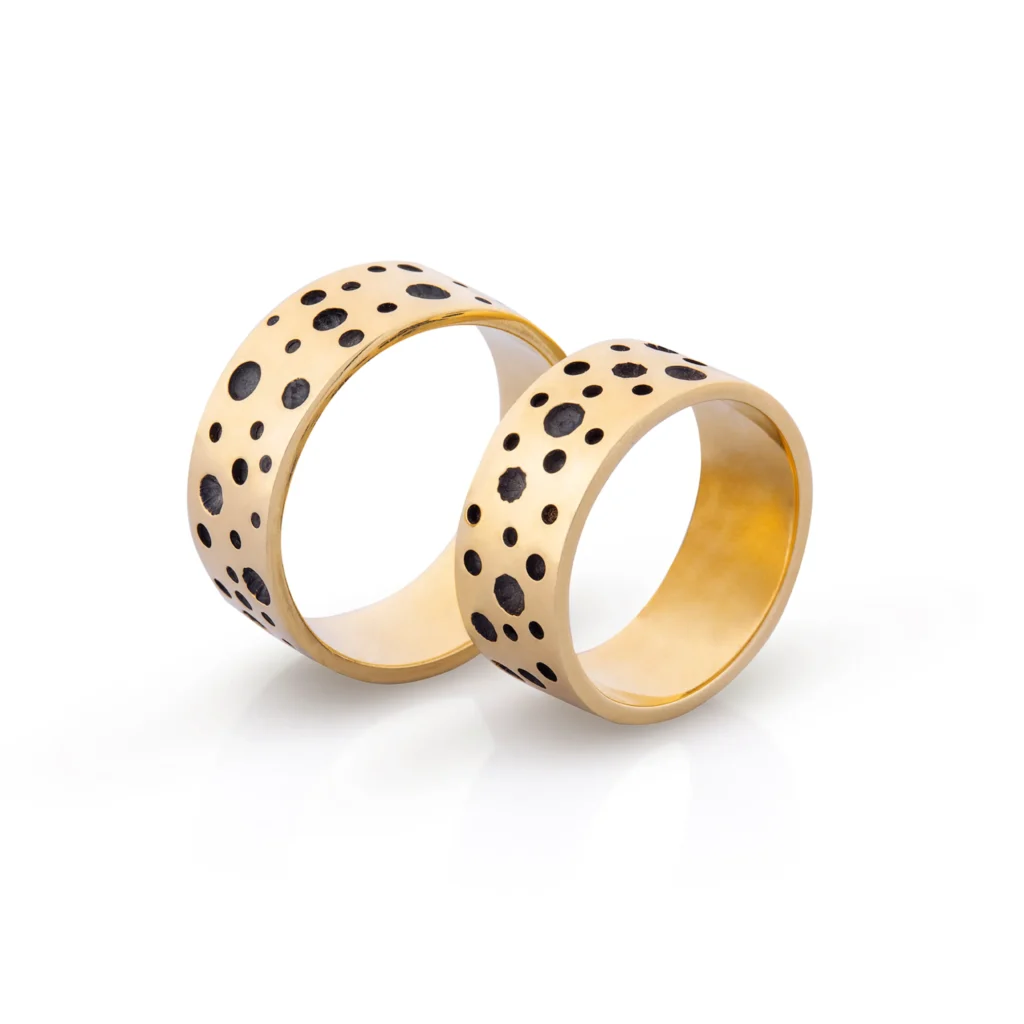 Dots rings in 18k yellow or white gold are available in sizes 5 to 13, with a subtle width of 0.8 cm.