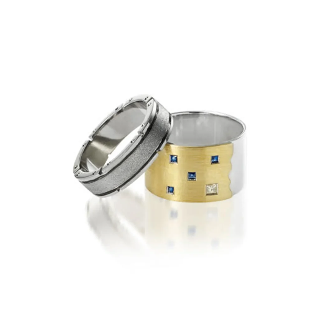 Wedding rings in 18k yellow or white gold are available in sizes 5 to 13, featuring a classic width of 1.4 cm.
