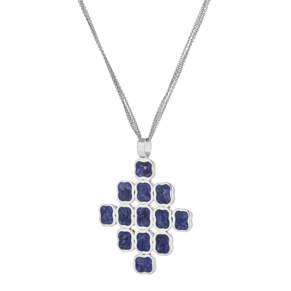 This striking sodalite chakana pendant in 18k white gold measures 5.7 cm x 4.4 cm (chain not included).