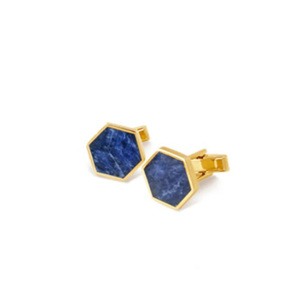 Hexagonal sodalite cufflinks in 18k yellow gold measure 1.5 cm x 1.7 cm, offering a unique flair.