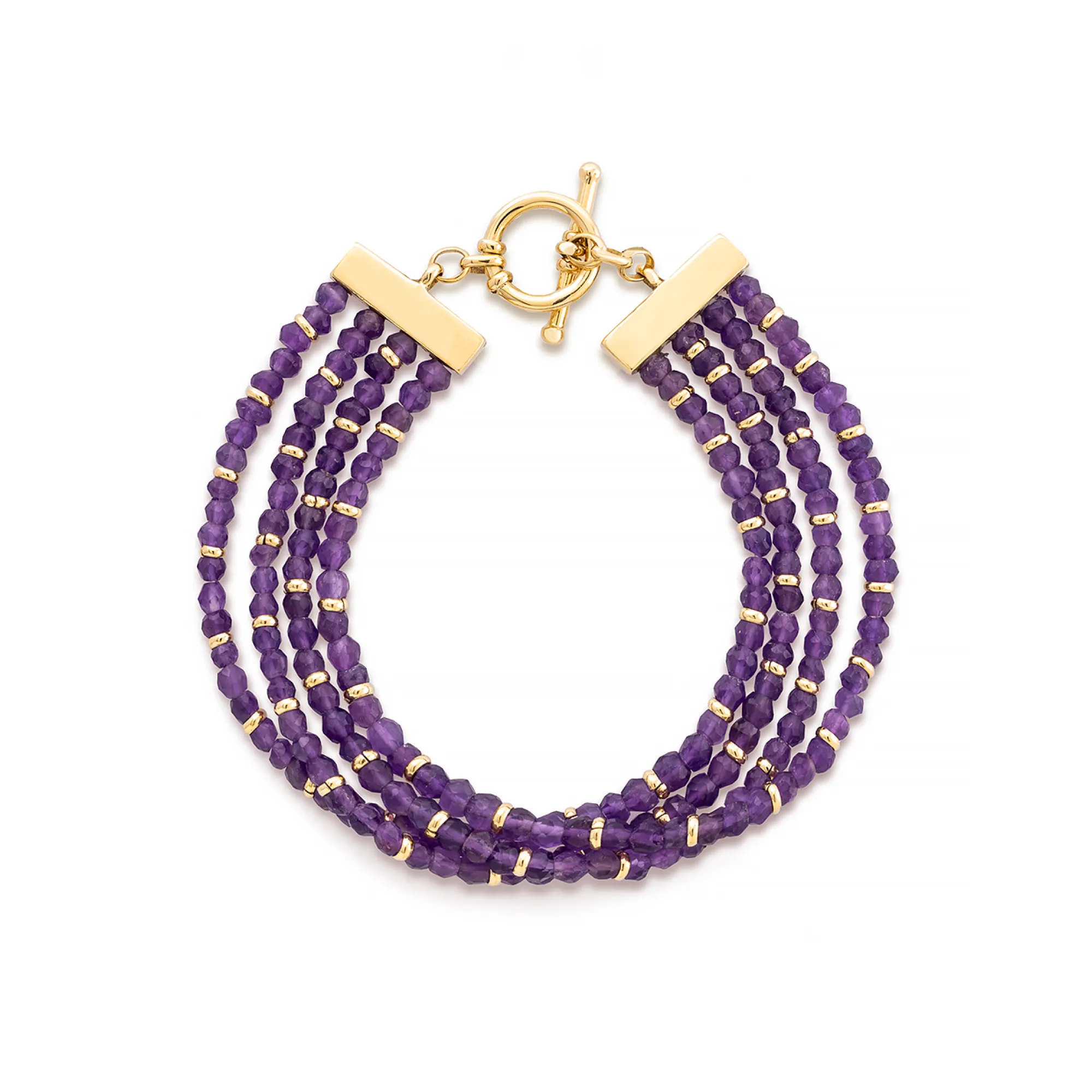 A stylish amethyst Chakiras bracelet in 18k yellow gold, 17cm in length, showcasing the calming hues of amethyst in a chic and vibrant design.