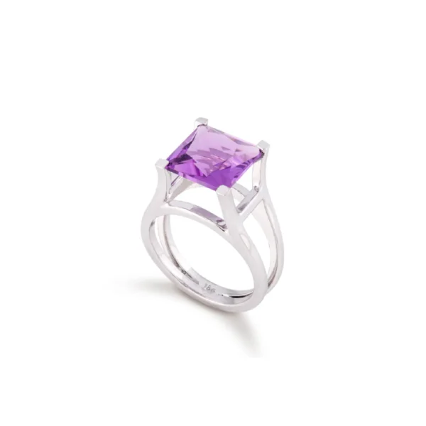 Elegant amethyst square ring in 18k white gold, showcasing a stunning 3.71 carat amethyst, available in size 6 3/4.