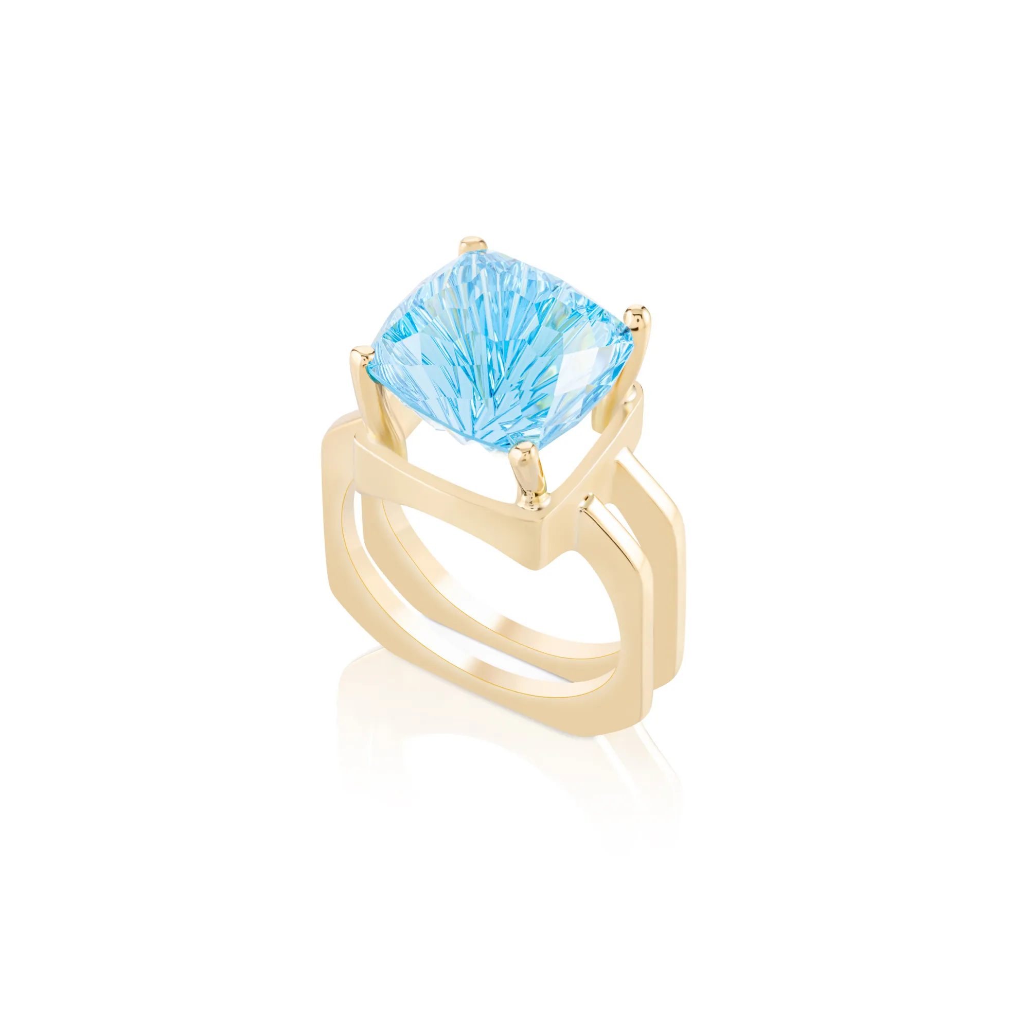 A striking laser blue topaz ring with an approximate weight of 11.37cts, available in sizes 5 to 9 and made in 18k yellow gold.