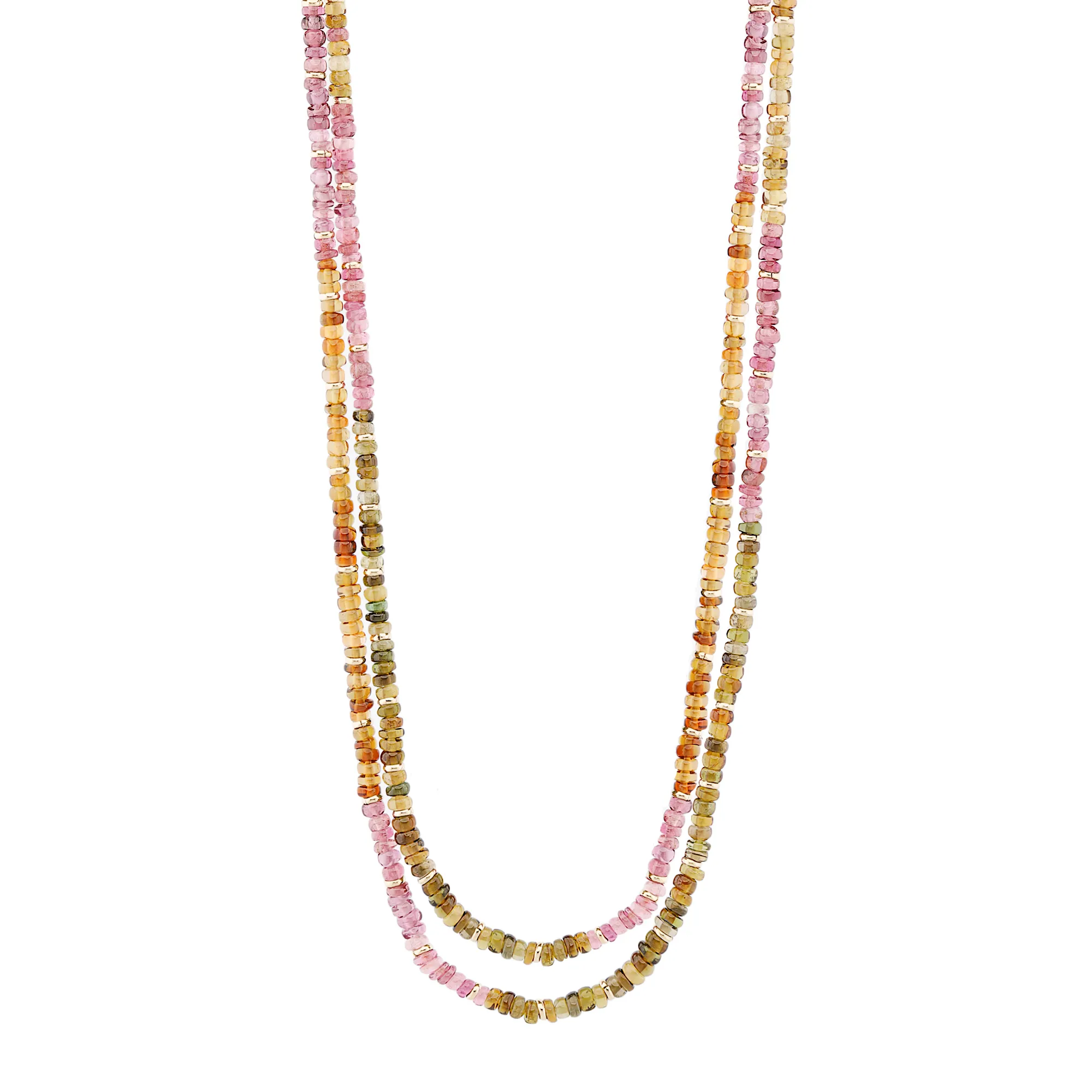 Colorful two-strand tourmaline necklace in 18k yellow gold, featuring lengths of 42.5 cm and 43 cm.