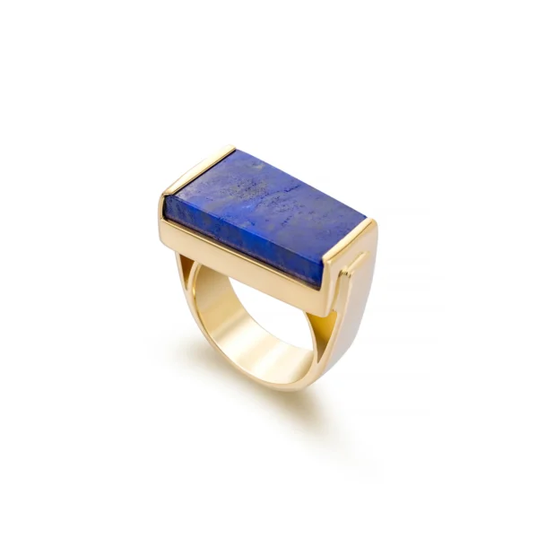 An enchanting lapis lazuli irregular ring in 18k yellow gold, featuring a unique organic design, available in sizes 5 to 9.