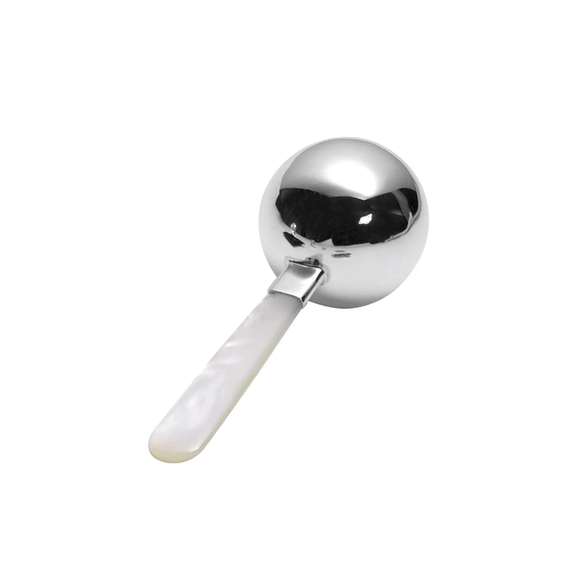 The ball rattle with mother of pearl in sterling silver features a ball diameter of 12.5 cm and a handle of 7 cm for playful interaction.