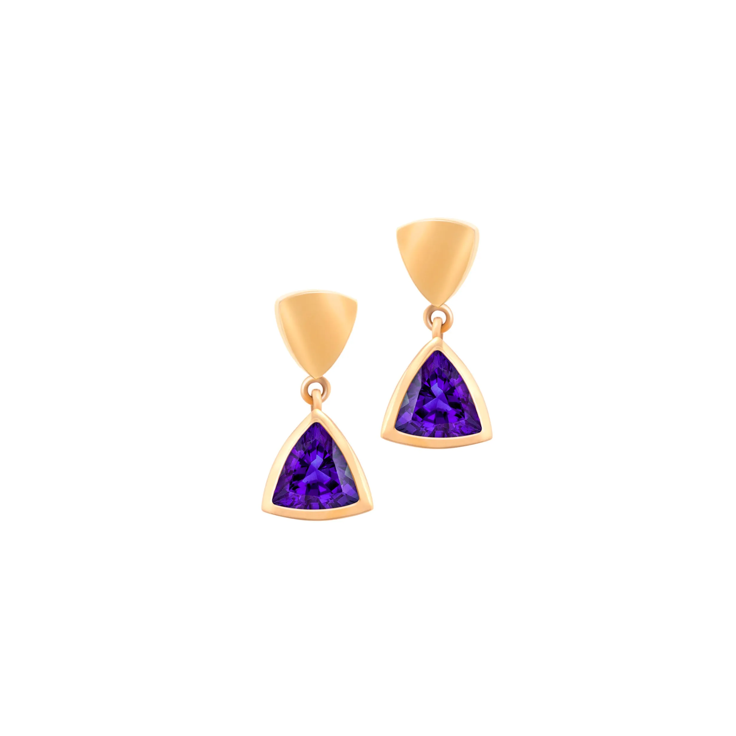 Stunning triangular earrings featuring tanzanite set in 18k yellow gold, with a striking length of 1.7 cm and dazzling tanzanite stones totaling 2.27 carats.
