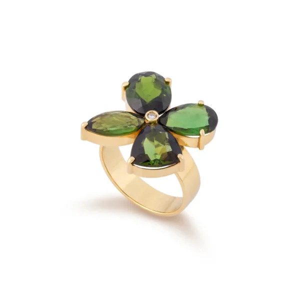Charming green tourmaline clover ring with a diamond in 18kt yellow gold, available in size 7, showcasing 4 green tourmalines totaling 8.75 carats and a diamond of 0.015 carats.