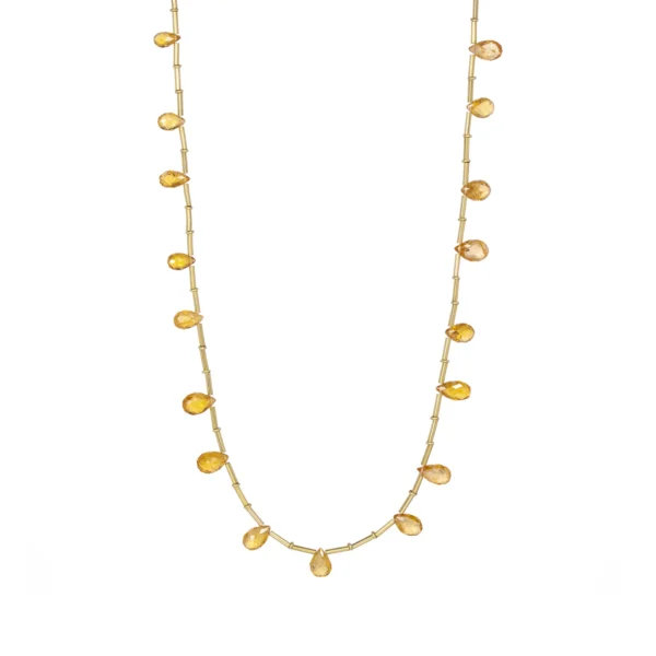 A refined yellow tourmaline necklace with drops and tubes in 18k yellow gold, with a 45 cm length for everyday elegance.